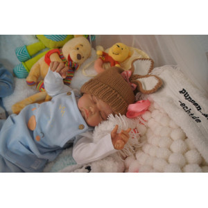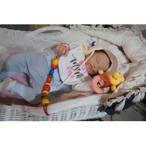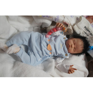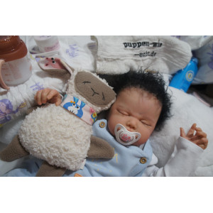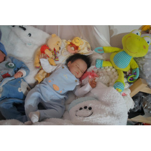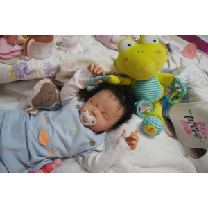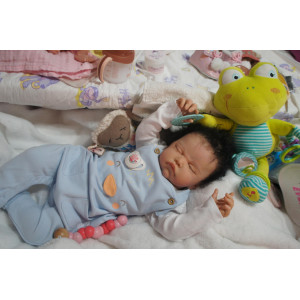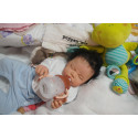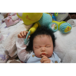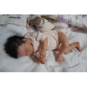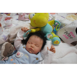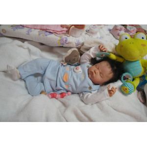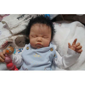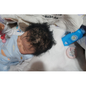 Meine Haare sind schwarz und im micro Rooting Verfahren einzeln eingepflanzt (Feinstes Mohair ). Anschließend natürlich von innen versiegelt. Und nun kann man meine Haare kämmen und auch mal leicht waschen. Die passenden Wimpern habe ich auch dazu gerootet bekommen, das sieht jetzt richtig echt aus. Meine Finger- und Fußnägel wurden fein Pedi- und Manikürt und anschließend dauerhaft versiegelt. Zum Schluss bekam ich noch einen Magnetschnuller. Und ein Duftöl aufgetragen, jetzt riech ich auch noch wie ein echtes Baby.